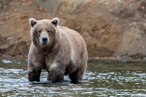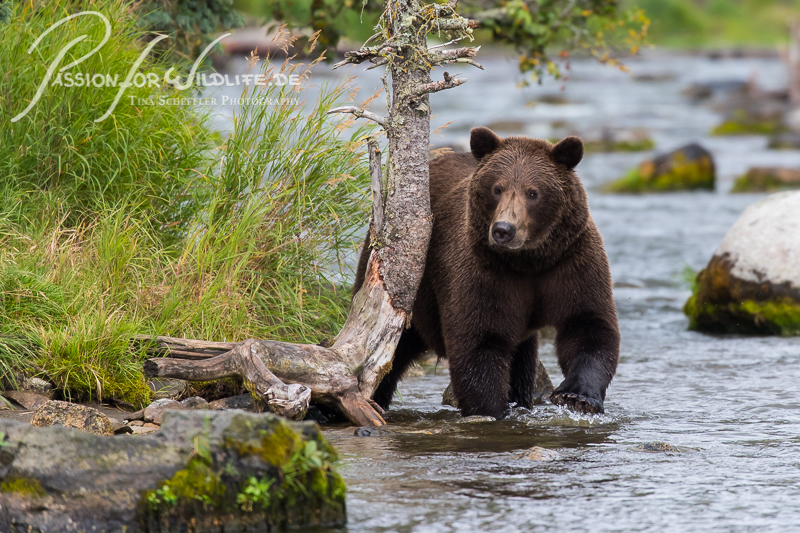 Mit einer Wathose ausgestattet geht es dann auch durch den Brooks River zu den Wasserfällen - Begegnungen auf Augenhöhe inklusive.