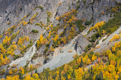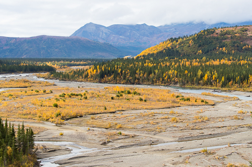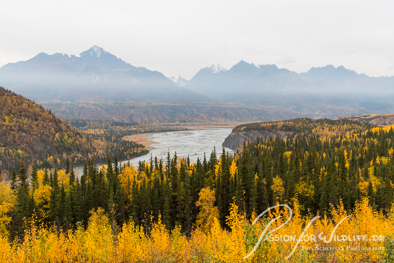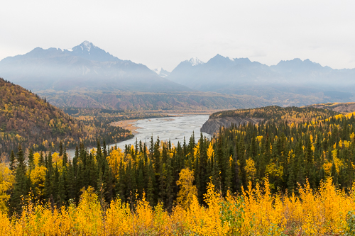 Die weiten Flußtäler sind von den gelben Blättern in Szene gesetzt.