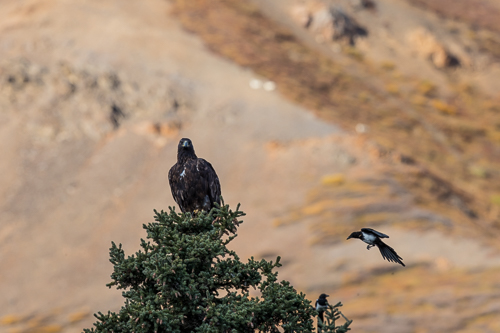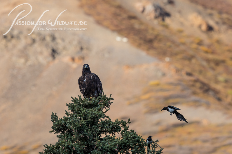 Wie viele Tierarten sind hier zu sehen? Drei…der Steinadler, die Elstern - und im Hintergrund die weißen Dallschafe.