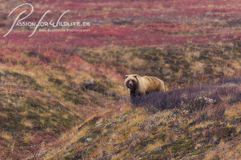 Im Denali Nationalpark sehen wir Grizzlybären durch die Herbstlandschaft streifen. Sie sind unter Stress, da der Winter bald bevorsteht.