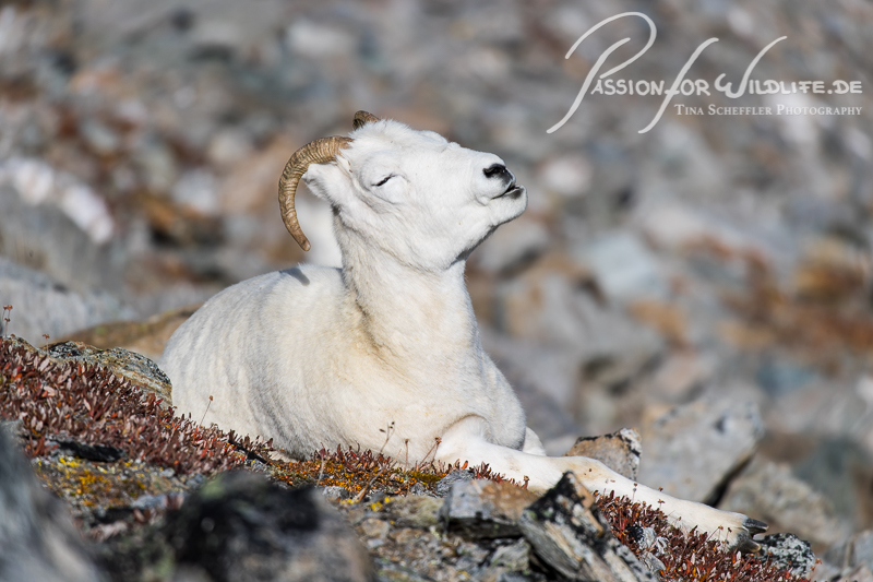 Etwas weiter entfernt liegen weitere Dallschafe am Hang und genießen die Sonnenstrahlen beim Wiederkäuen.