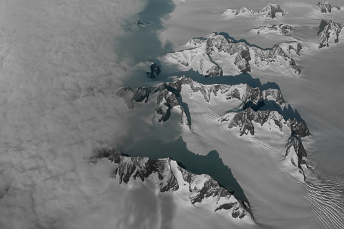 Grönland ist bedeckt von Eismassen. Aus dem Flieger sehe ich nur die Bergspitzen aus dem Eis herausragen. Dies ist unsere erste Alaska-Tour im September.