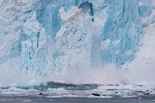 Die Seehunde lassen sich nur wenig von dem kalbenden Gletscher beeindrucken, auch wenn das Eis eine riesige Welle verursacht.