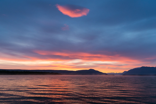 Der Abschied vom Katmai Nationalpark gestaltet sich farbenfroh: mit einem wunderschönen Sonnenuntergang.