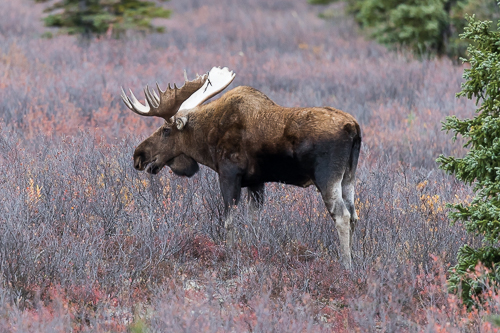 Wer genau hinguckt, entdeckt zwischen den Bäumen den einen oder anderen Elch. Hier ein junger Bulle.