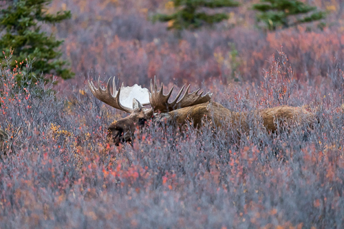 Im hohen Buschwerk ist selbst so ein massiver Elchbulle wie dieser nur schwer zu entdecken.
