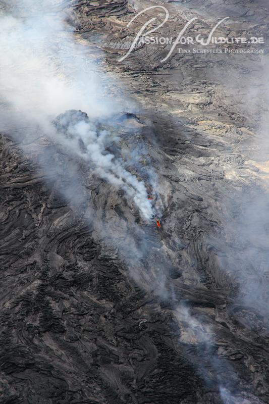 Aus dem Helikopter heraus kann man zusehen, wie die Lava durch die Landschaft „frisst“. Alles, was sich auf ihrem Weg befindet, wird unter Feuer begraben.