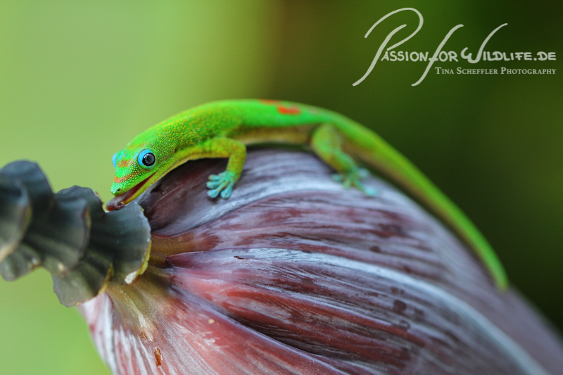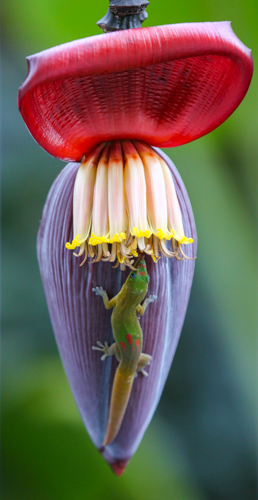 Morgens warten die Goldstaub-Taggeckos darauf, dass sich die Bananenblüten öffnen. Dann schlecken sie den süßen Blütensaft.