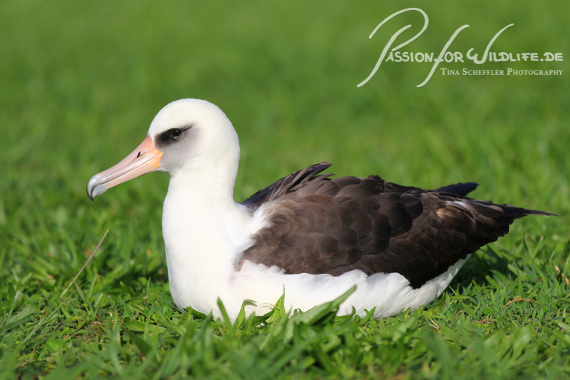 Dieser Laysan-Albatros war sehr zutraulich und hat es sich inmitten eines Parks auf dem Rasen gemütlich gemacht.