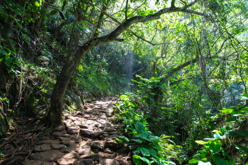 Der Kalalaui Wanderweg führt an diesen knapp 1000m hohen pflanzenbewachsenen Lavafelsen entlang.