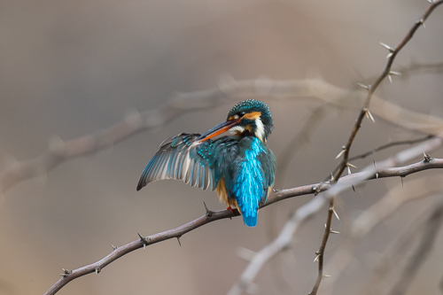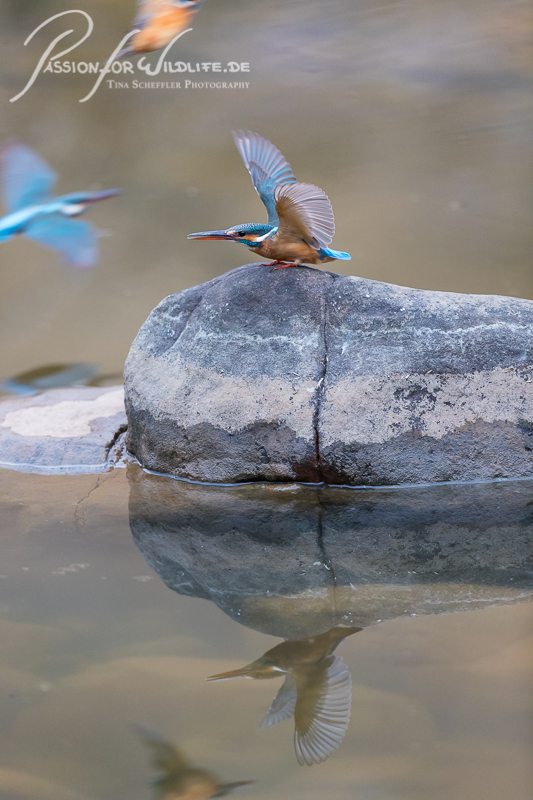 Dieser Eisvogel begrüßt zwei vorbei fliegende Artgenossen