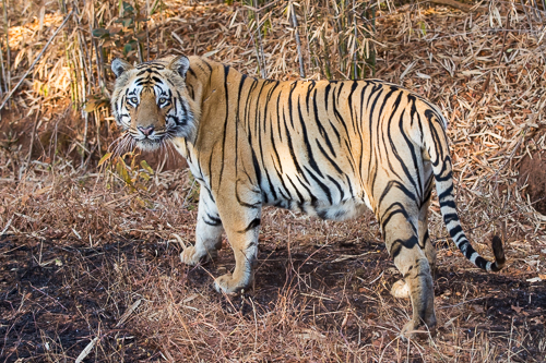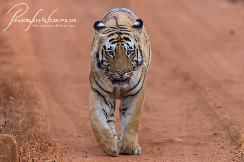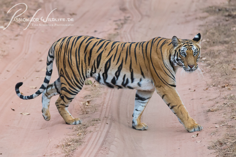 Tigerweibchen beim Überqueren des Weges im Bandharvgarh Nationalpark
