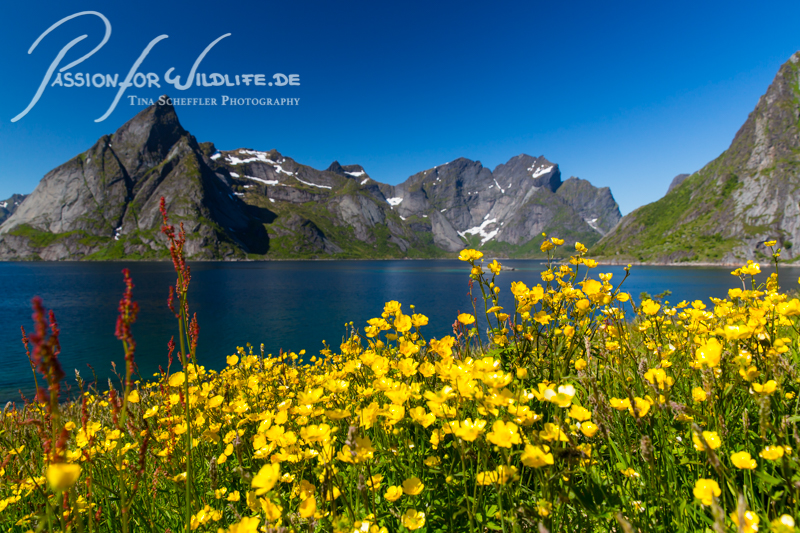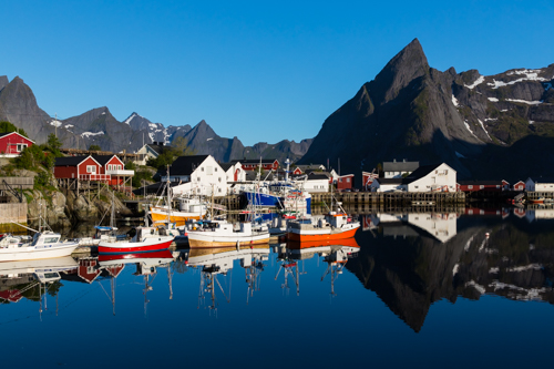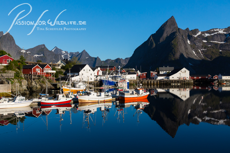 Bei Hamnøy gibt es dann auch die typischen Eindrücke von den Lofoten: kleine Fischerdörfer und große Berge, die sich bei Windstille im Wasser spiegeln.