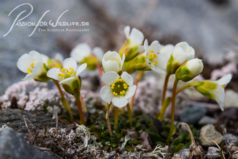 Daneben blühen auch die Diapensien mit ihren zarten, weißen Blüten.