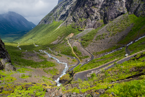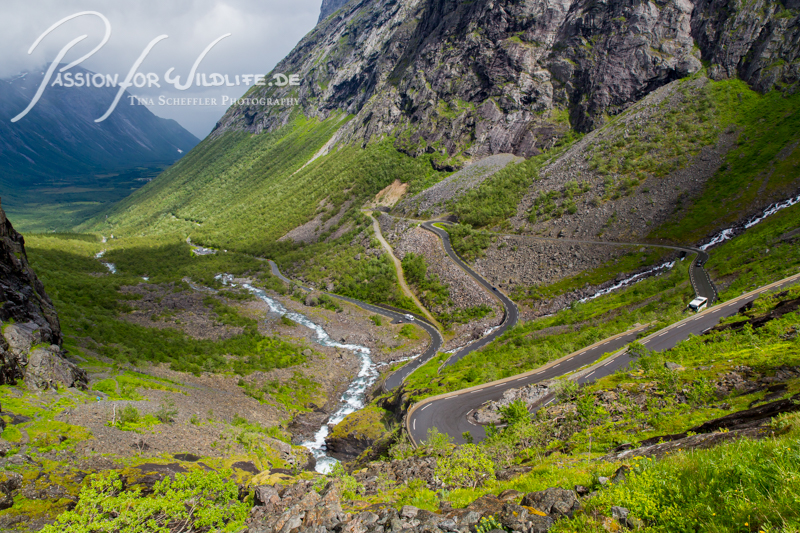 Auf der Weiterfahrt an die Küste passieren wir den berühmten Trollstigen mit seinen engen Kurven.