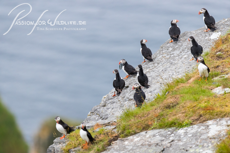 Jede noch so kleine Höhle ist von Papageientauchern besetzt. Einige Vögel warten vor den Höhlen auf den anfliegenden Partner.
