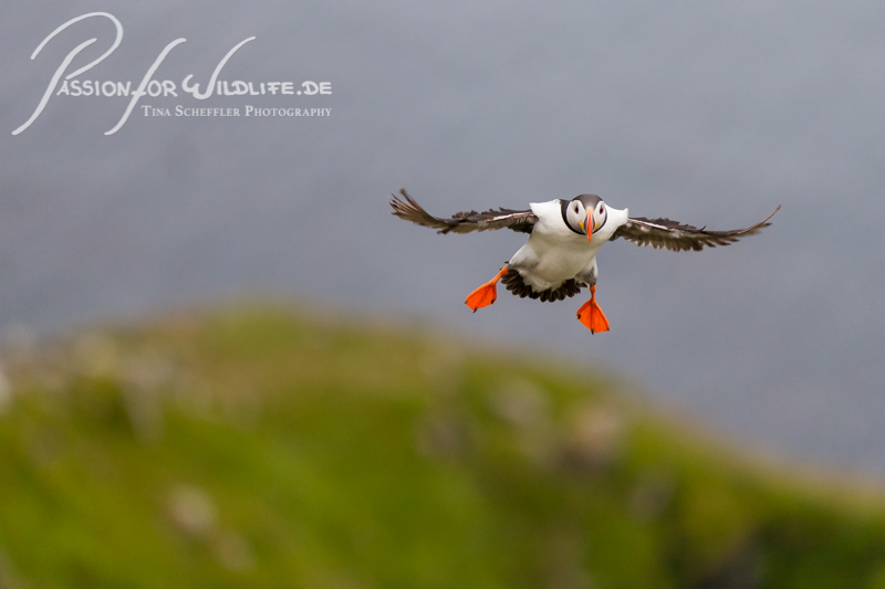 Ständig sausen Papageientaucher an uns vorbei oder sogar direkt auf uns zu - fotografisch ist dies sehr herausfordernd.