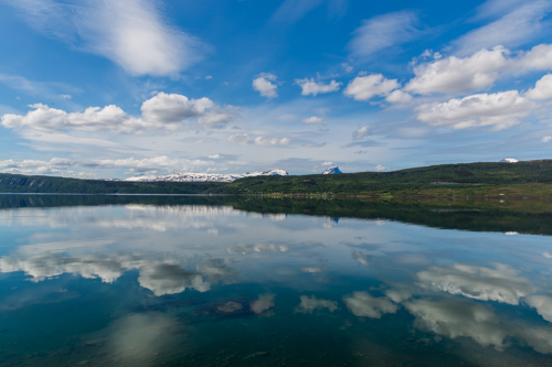 Von Schweden aus geht es über die Riksgrensen nach Norwegen und an die Fjorde. Kurz nach diesem Foto weht ein Wind über den Fjord und die Spiegelung ist weg.