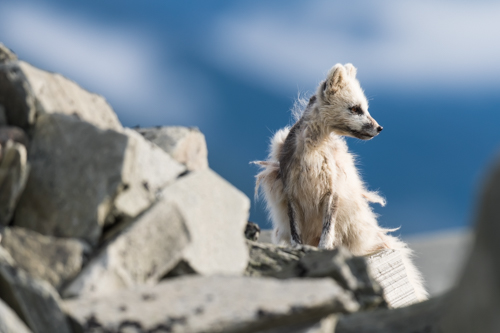 So struppig sieht die Polarfüchsin nur aus, weil sie gerade ihr Fell wechselt. Das weiße Winterfell weicht dabei dem braunen Sommerfell.