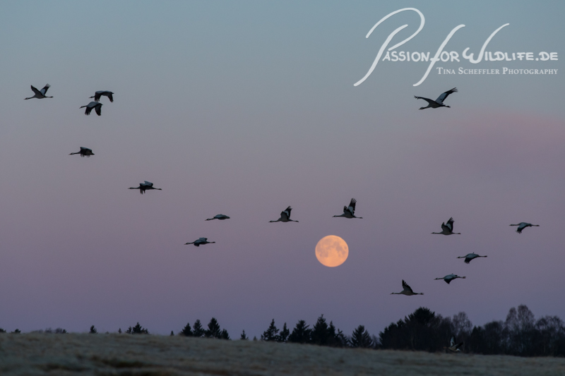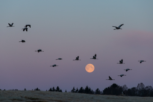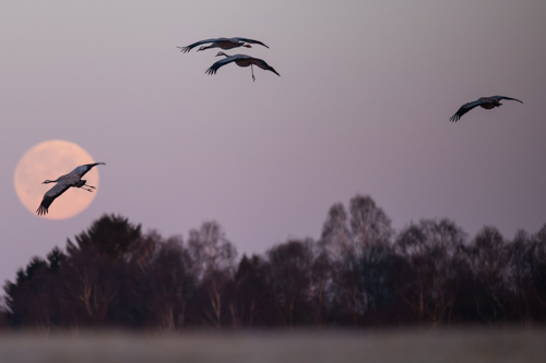 Mit dem untergehenden Mond und der aufgehenden Sonne kommen die ersten Kraniche angeflogen.