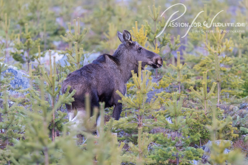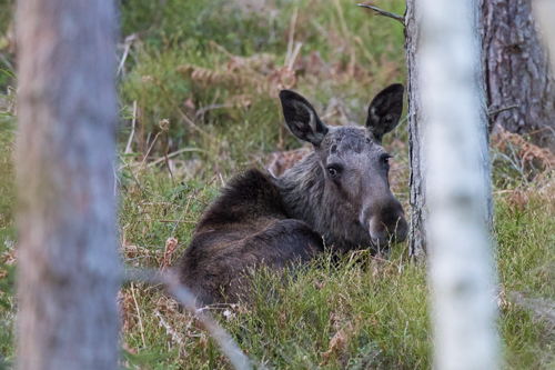 Diesen Elch entdeckten wir kurz vor Sonnenuntergang in einem jungen Tannenwald.