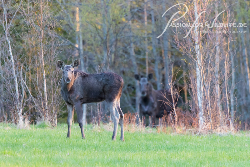 Zurück in Südschweden entdeckten wir diesen jungen Elch auf einer Wiese. Erst auf den zweiten Blick entdeckten wir die Elchmutter im Hintergrund.