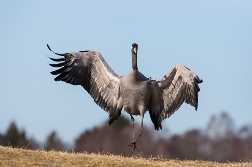 Tagsüber fressen die Kraniche das Getreide, das auf den Wiesen ausgestreut wurde.