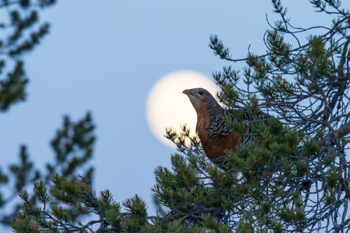 Später flog sie auf einen Baum. Von dort aus rief sie, während im Hintergrund der Vollmond aufging.