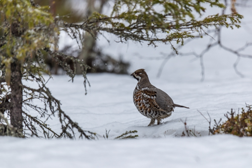 Dieser Haselhahn versteckte sich hinter einem Baumstumpf und kam schließlich vorsichtig dahinter hervor.