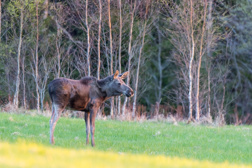 Je weiter die Sonne unterging, desto weiter traute sich der kleine Elch auf die Wiese.